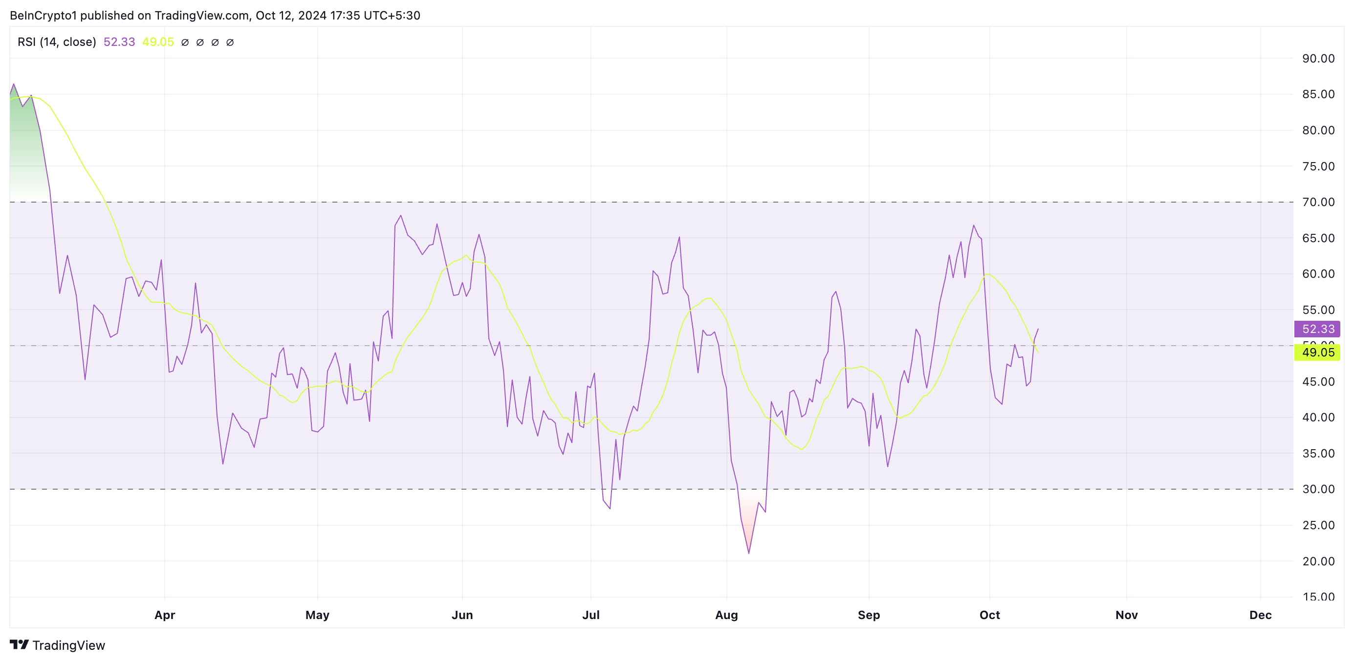 Di samping itu, lonjakan bertahap dalam Relative Strength Index (RSI) TOTAL2 (kapitalisasi pasar gabungan semua altcoin) turut menyokong prospek ini. Saat publikasi, RSI TOTAL2, yang mengukur kondisi overbought dan oversold atau jenuh beli dan jenuh jual, berada dalam tren naik di 53,15. Nilai ini menandakan adanya kenaikan akumulasi di pasar altcoin.