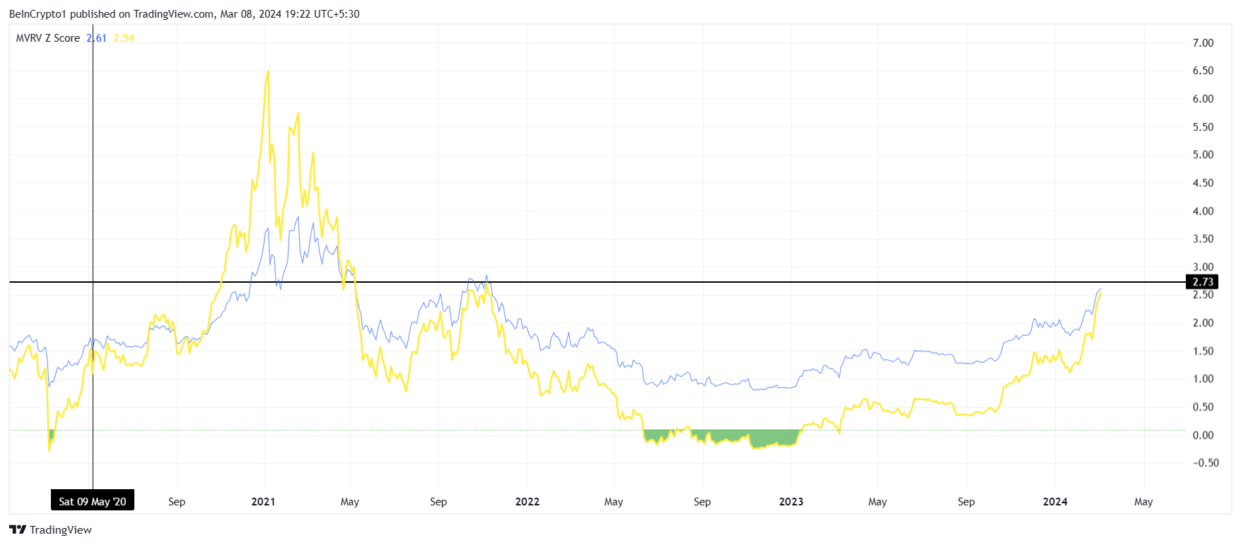 MVRV Z-score sendiri merupakan metrik yang membandingkan nilai pasar mata uang kripto dengan nilai realisasinya, yang menandakan nilai yang terlalu tinggi atau terlalu rendah. Skor positif menyiratkan overvaluation dan undervaluation negatif, sehingga membantu investor dalam mengukur sentimen pasar dan potensi hasil harga.