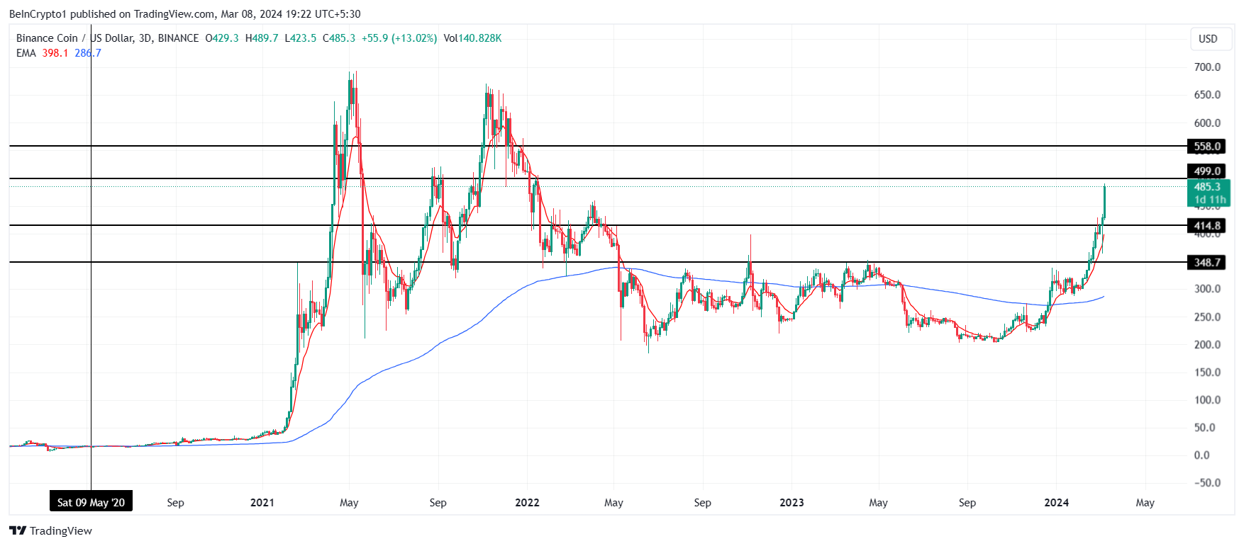 Harga BNB diperdagangkan pada US$485 pada saat artikel ini ditulis, mendekati level resistance dua tahunnya di US$499. Namun, merujuk pada perkembangan yang disebutkan di atas, skenario yang mungkin terjadi untuk BNB adalah penurunan harga.