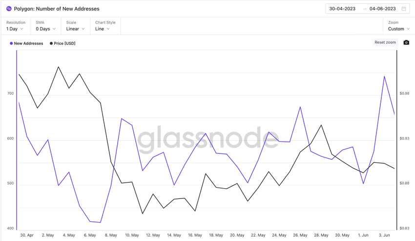 Dalam seminggu terakhir, proliferasi Polygon ZkEVM yang semakin luas tampaknya membantu solusi penskalaan Ethereum unggulan ini menarik pengguna baru. Grafik Glassnode di bawah ini menunjukkan bahwa pada tanggal 3 Juni, Polygon membukukan pertumbuhan jaringan tertinggi sejak 26 April 2023.