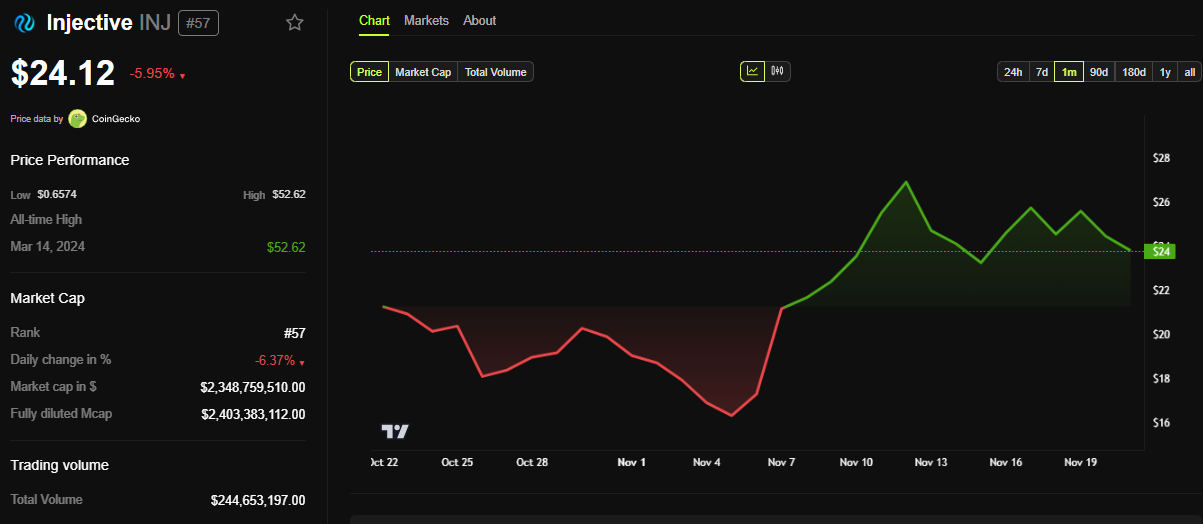 Saat Injective memasuki ruang ini, ia menghadapi persaingan tidak langsung dari para pemain ini. Sementara itu, meskipun menghadapi usaha ini, token penggerak Injective, INJ, turun hampir 6%. Data BeInCrypto menunjukkan bahwa saat ini diperdagangkan seharga US$24,12.