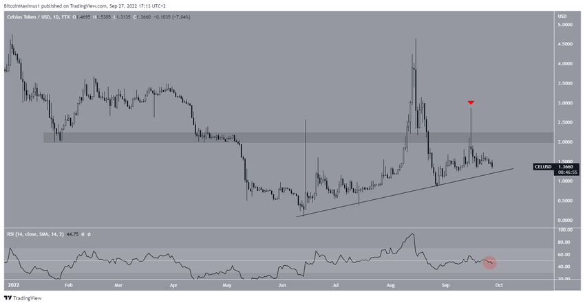 Kini, CEL telah kembali ke garis ascending support. Apabila CEL menembus ke bawah garis itu, maka kemungkinan besar token ini akan mencetak rekor terendah baru untuk tahun ini.