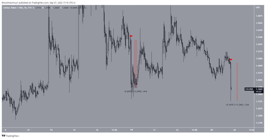 Kabar atas pengunduran diri Mashinsky sebagai CEO Celsius lagi-lagi memberikan imbas kurang baik bagi pergerakan harga CEL. Tak lama setelah pengumuman itu muncul, CEL terlihat menurun sebanyak 11% dan menyentuh titik US$1,31. Titik tersebut sekaligus menjadi harga terendahnya dari sejak 9 September. Selain itu, pergerakan ini juga merupakan aksi penurunan paling tajam dalam time frame per jam, jika diukur dari saat 18 September (lihat simbol merah pada gambar).