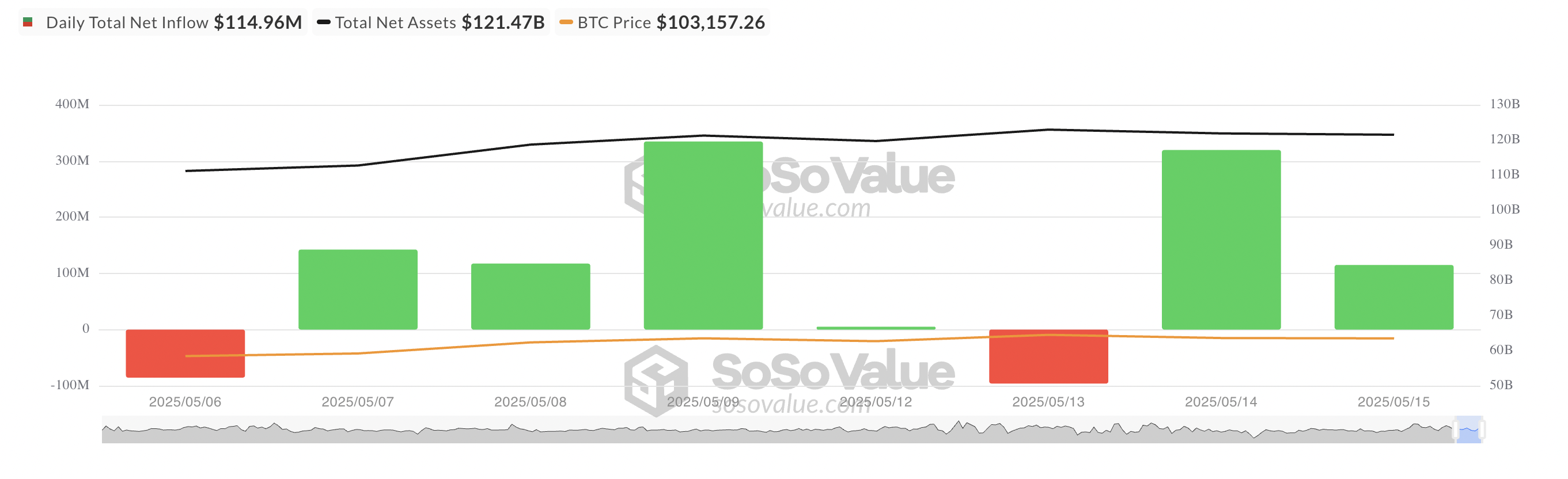 Pada hari Kamis, arus bersih ke dalam ETF BTC mencapai US$114,96 juta, turun 64% dari US$319,56 juta pada hari Rabu. Meskipun ini menandakan minat institusi yang berkelanjutan terhadap dana ini, angka kemarin menunjukkan penurunan tajam dari arus masuk hari Rabu, menunjukkan pendinginan sementara dalam momentum.
