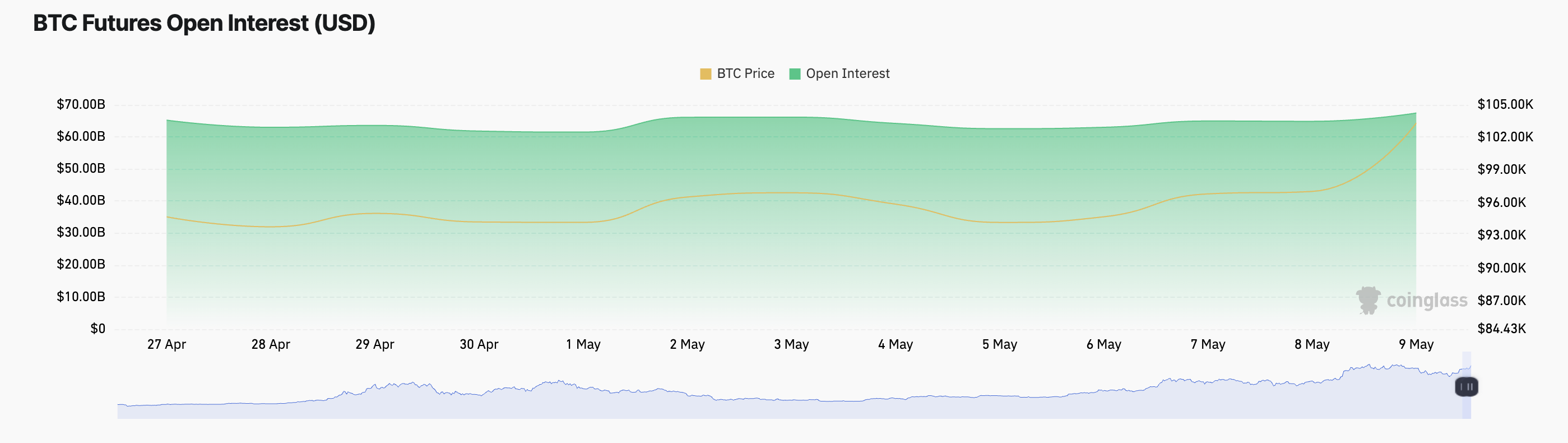 Hal ini tercermin dari open interest futures koin, yang saat ini mencapai US$67,45 miliar dan telah naik 5% dalam sehari terakhir. Ketika open interest suatu aset naik bersamaan dengan harganya, uang baru masuk ke pasar untuk mendukung tren tersebut, menunjukkan momentum bullish yang kuat.