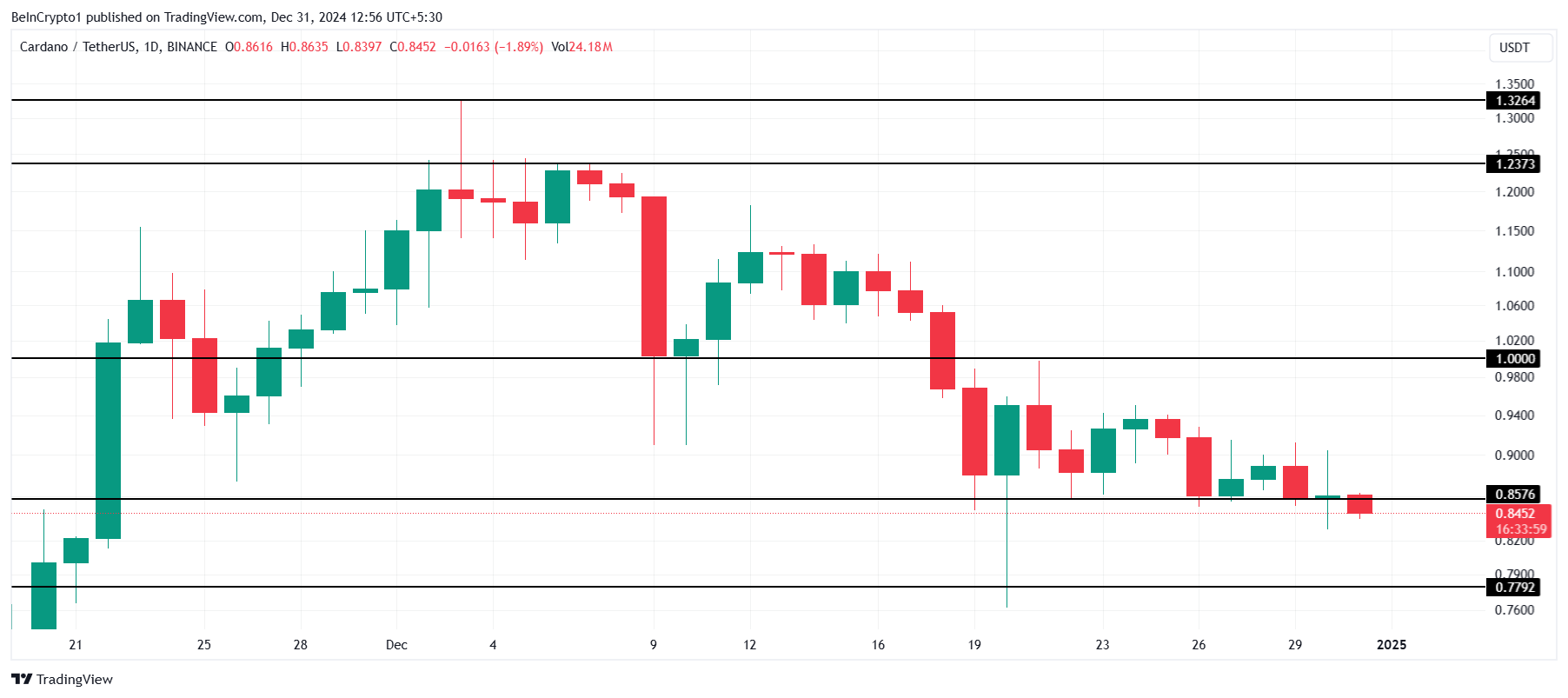 Harga Cardano saat ini sebesar US$0,84 telah turun di bawah level support krusial US$0,85. Meskipun ADA berhasil bertahan di atas level ini dalam beberapa hari terakhir, tekanan baru dalam 24 jam terakhir menyebabkan kerugian lebih lanjut. Penurunan ini menempatkan ADA dalam posisi yang genting.