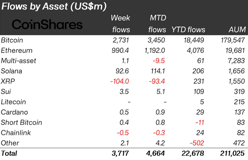 Menurut laporan terbaru CoinShares, arus masuk minggu lalu yang mencapai US$3,7 miliar, mendorong total aset yang dikelola (AuM) ke rekor tertinggi sepanjang masa sebesar US$211 miliar.