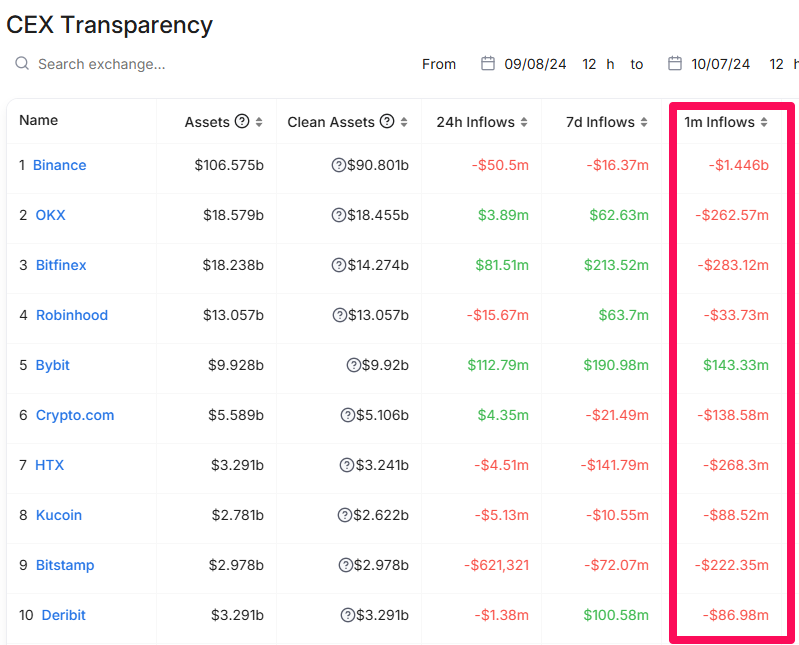 Data CEX Transparency dari Defillama, yang melacak arus masuk dan keluar dari alamat wallet publik berbagai bursa, memungkinkan investor untuk memantau pergerakan modal. Data menunjukkan bahwa 9 dari 10 bursa yang dipantau melaporkan arus masuk negatif dalam sebulan terakhir.