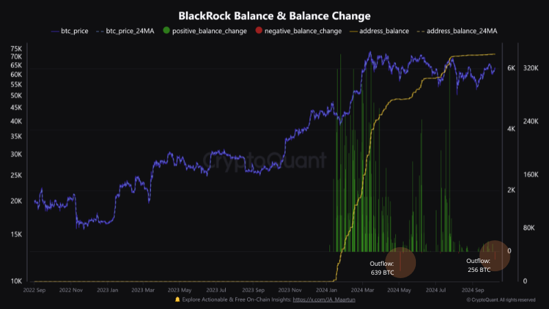 Data CryptoQuant menunjukkan bahwa alamat on-chain yang terkait dengan ETF BlackRock mengalami penarikan 256 BTC, yang menandai penarikan terbesar kedua di tahun ini. Grafik menunjukkan bahwa akumulasi BlackRock telah melambat dibandingkan awal tahun 2024.