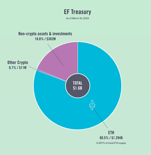 Perbendaharaan yayasan EF mencapai sekitar US$1,6 miliar yang terbagi antara US$1,3 Miliar (81,2%) dalam kripto, serta US$302 juta (18,8%) dalam investasi dan aset non-kripto, per 31 Maret 2022.