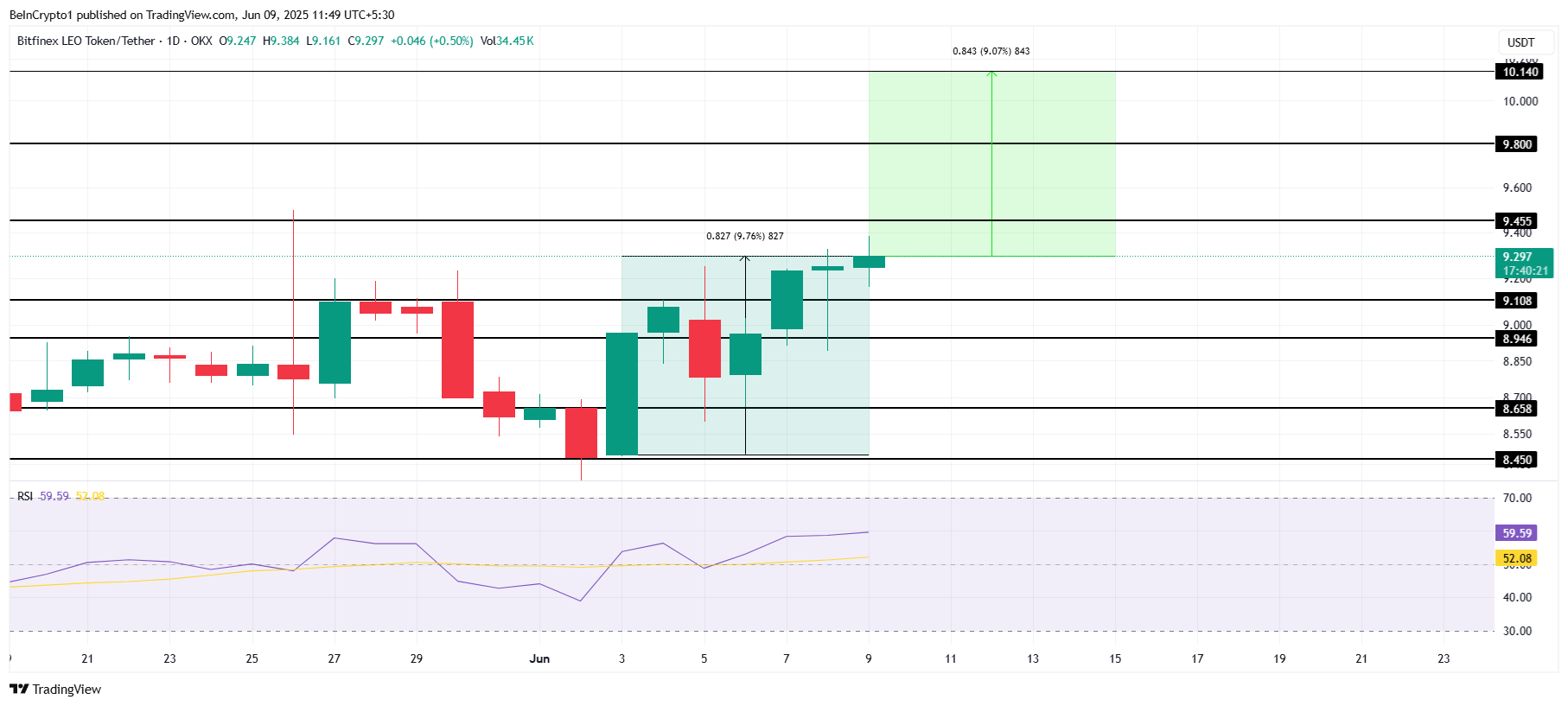 Relative Strength Index (RSI) LEO saat ini berada di zona bullish, di atas garis netral. Ini artinya masih ada ruang untuk momentum naik sebelum altcoin ini mencapai batas overbought (jenuh beli). Selama RSI tetap berada dalam kisaran ini, LEO bisa siap untuk menyambut reli harga lebih lanjut, berpotensi mencapai ATH di US$10,14 atau lebih, asalkan dapat menembus US$9,45 dan US$9,80 terlebih dahulu.