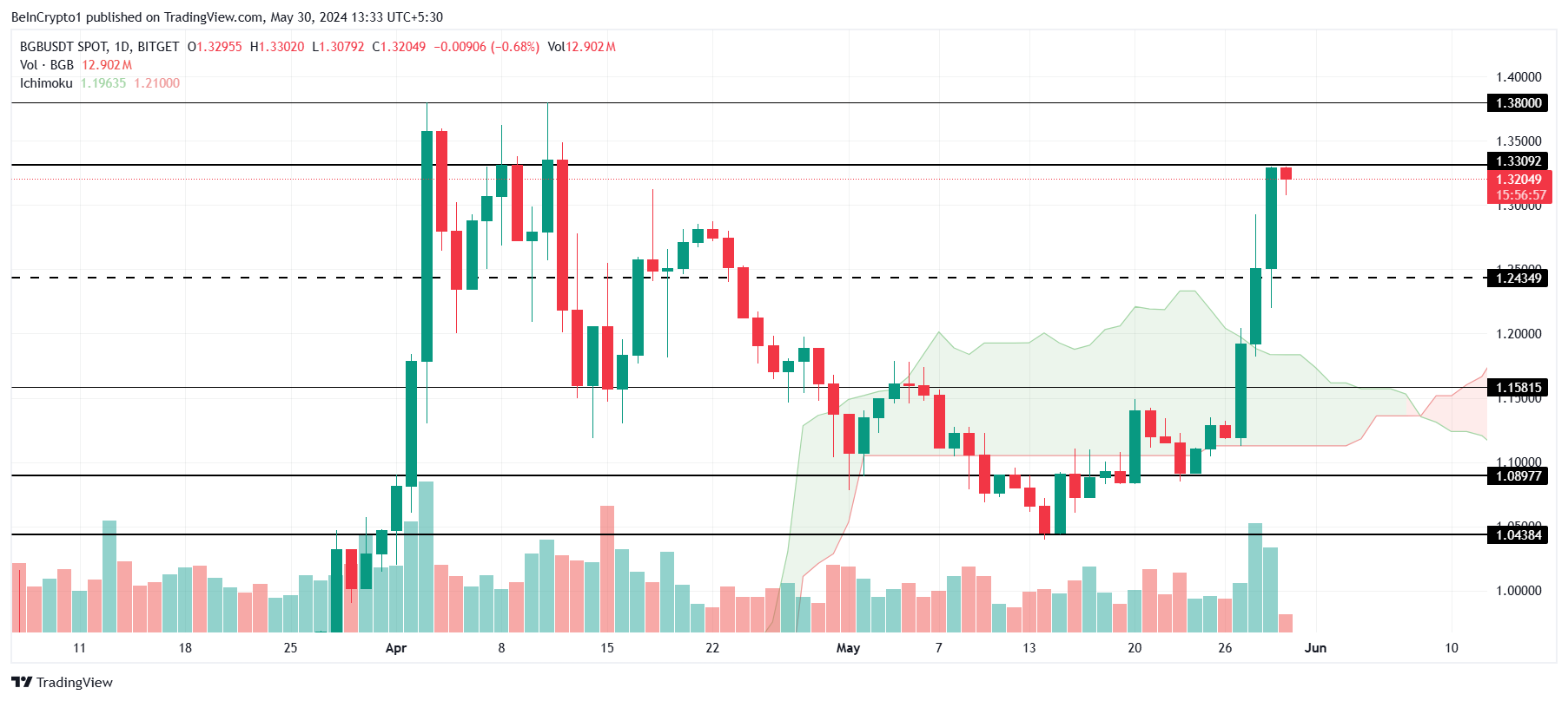 Harga BGB sama sekali tidak mendekati rekor ATH baru sampai seminggu yang lalu. Beruntung, reli 16% yang terjadi dalam beberapa hari terakhir mengubah hal ini, membawa altcoin untuk diperdagangkan seharga US$1,32. Rekor ATH-nya sekarang hanya berjarak kurang dari 5% di US$1,38.