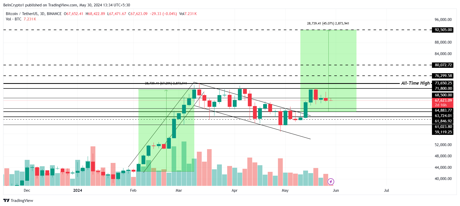 Harga Bitcoin telah berkitar di angka US$68.500 selama beberapa hari belakangan. Hanya saja, area itu belum berhasil menjadi support floor. Ini sangat penting jika aset kripto ini menargetkan rekor ATH baru karena penghalang antara BTC dan ATH di US$73.650 adalah US$71.800.