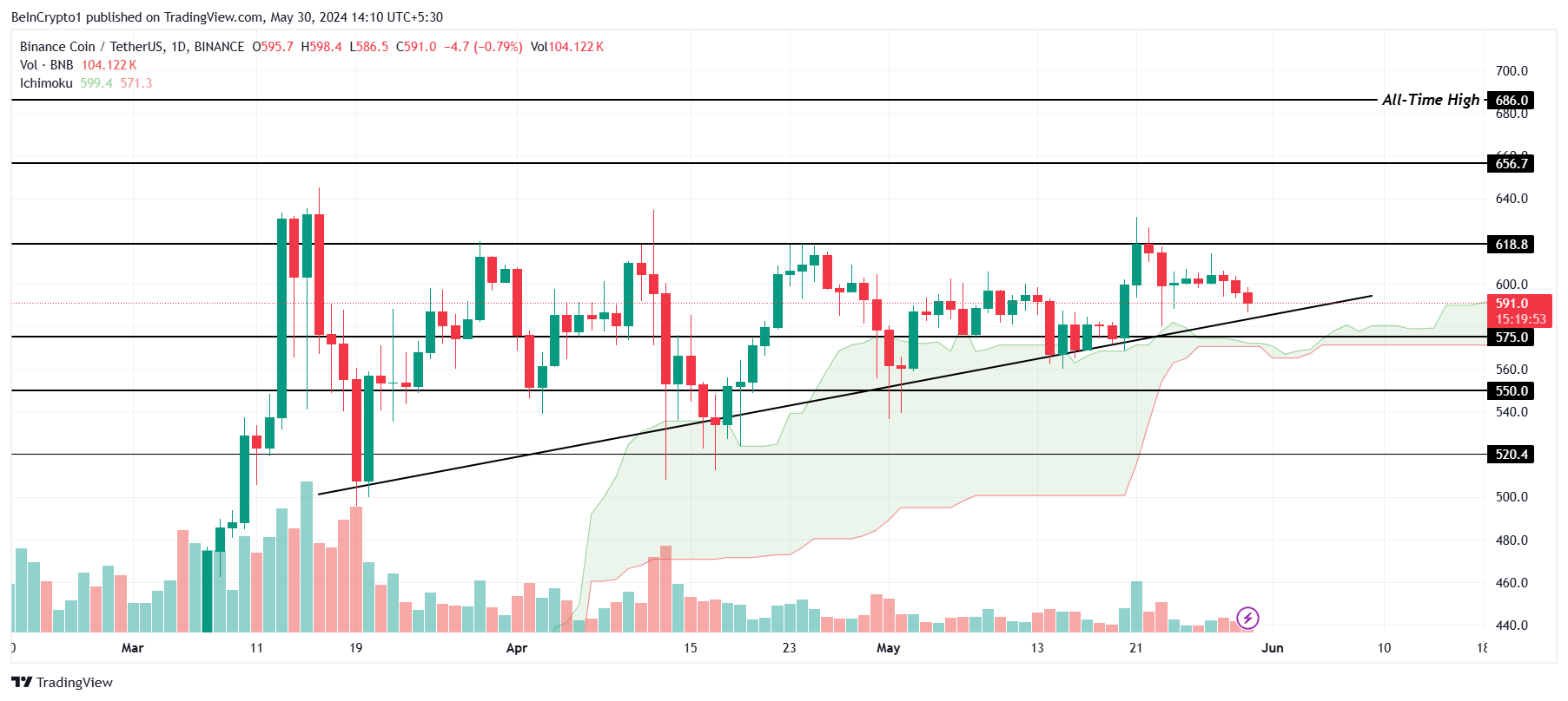 Native token Binance ini sekarang hanya berjarak 13% lebih sedikit dari level ATH US$686. Saat ini, harganya nangkring di US$591. Ichimoku Cloud tidak hanya menyoroti sinyal bullish tetapi juga berada di bawah candlestick. Sehingga, ini memperkuat optimisme tentang rekor ATH.