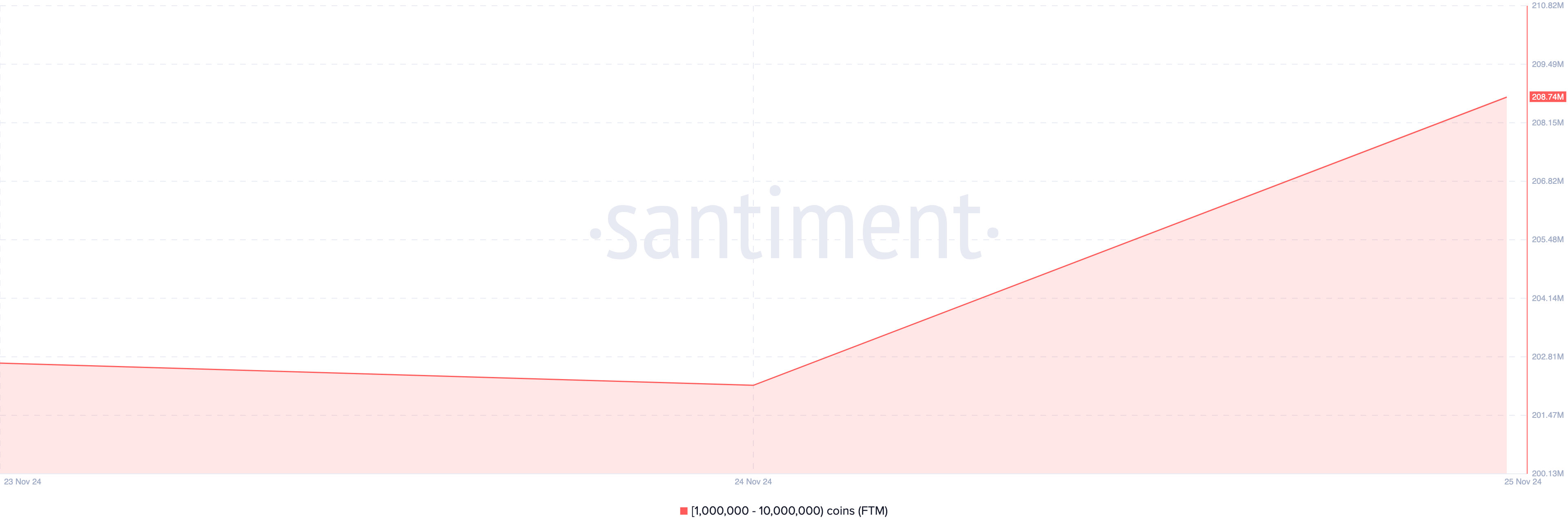 Menurut Santiment, saldo alamat wallet yang memegang 1 juta hingga 10 juta FTM adalah sekitar 202 juta pada 24 November. Namun, per 29 November, angka tersebut melesat menjadi 208,74 juta. Itu artinya, crypto whale bisa saja sedang bersiap untuk menyambut reli FTM yang substansial.