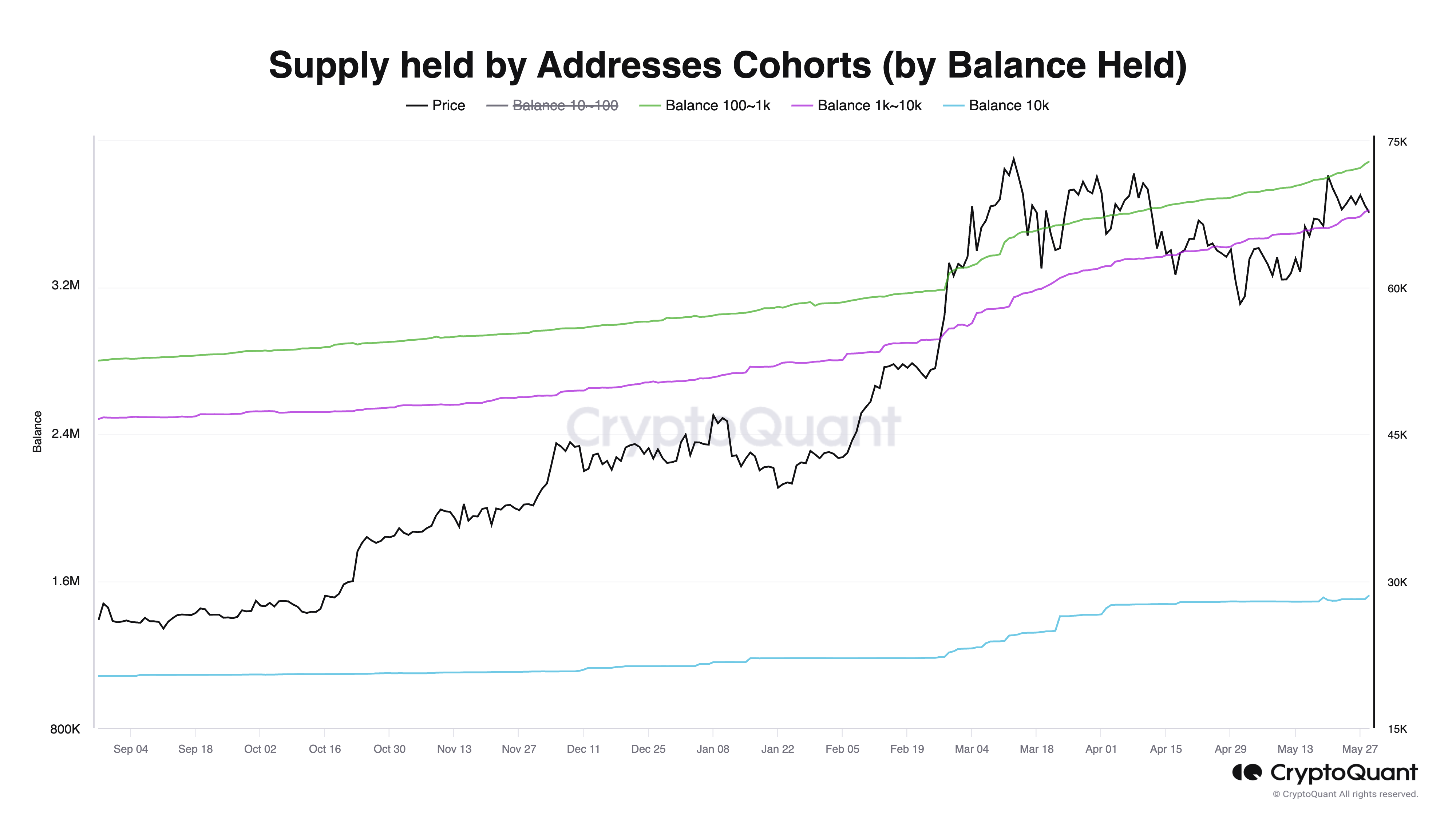 Grafik dari CryptoQuant menunjukkan, wallet yang memegang antara 100 – 10.000 BTC telah secara konsisten melakukan akumulasi. Menariknya lagi, kelompok ini berhasil mencapai rekor ATH (all-time high) baru dalam hal pasokan yang mereka miliki.