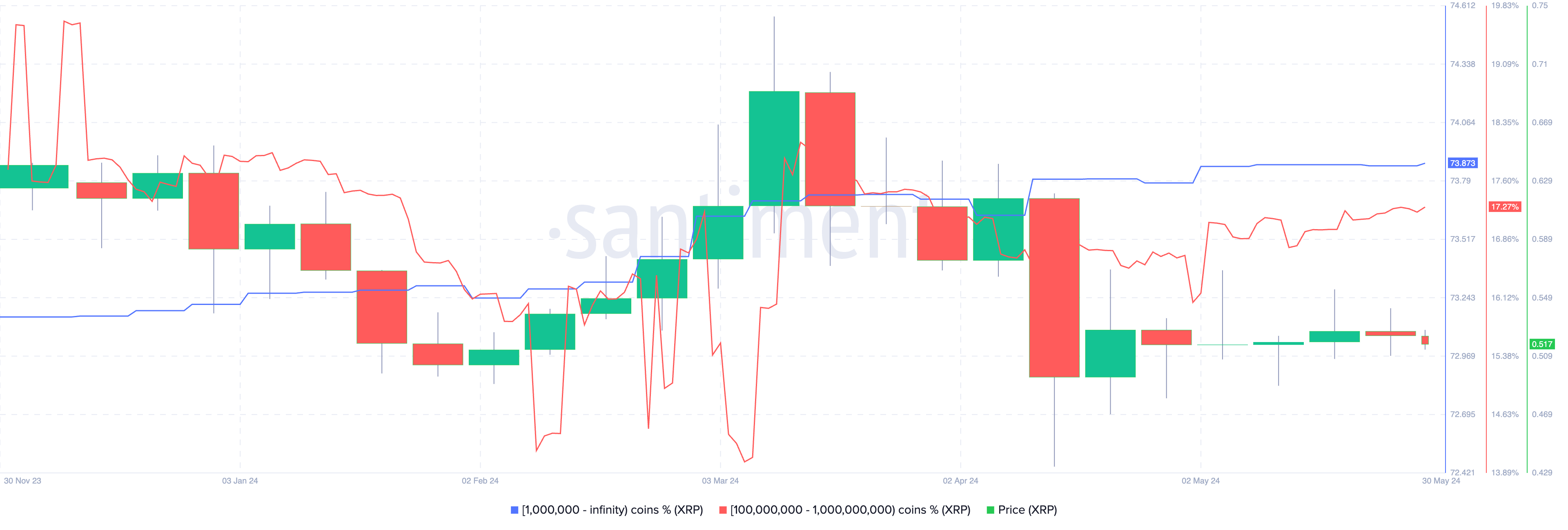 Sebaliknya, garis merah melacak kepemilikan alamat dengan 100 juta hingga 1 miliar XRP dan menampilkan lebih banyak variabilitas. Terpantau ada fluktuasi intens, terutama sekitar awal Februari dan pertengahan Maret. Namun secara keseluruhan, kelompok ini menunjukkan tren kenaikan dalam hal kepemilikan mereka.