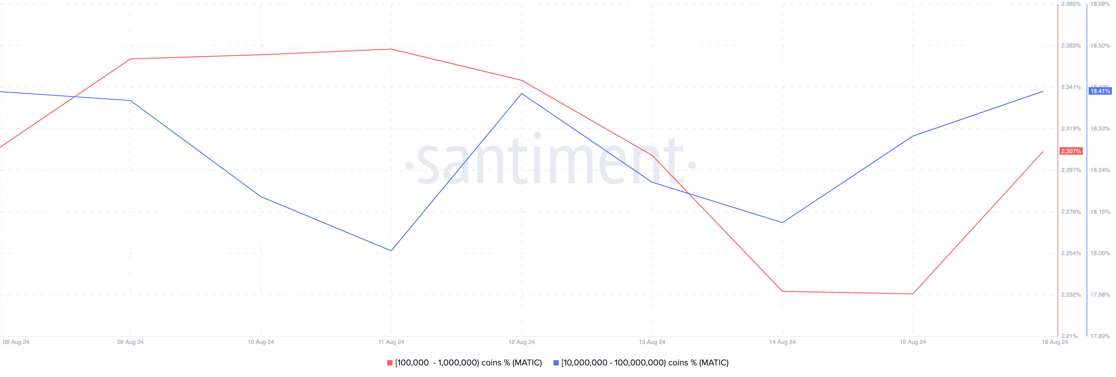Namun, data on-chain dari Santiment mengonfirmasi bahwa whale telah secara intensif mengakumulasi MATIC. Saldo alamat yang menampung 100.000 hingga 1 juta token telah melesat, begitu pula saldo kelompok 10 juta hingga 100 juta yang juga menambah kepemilikan mereka.