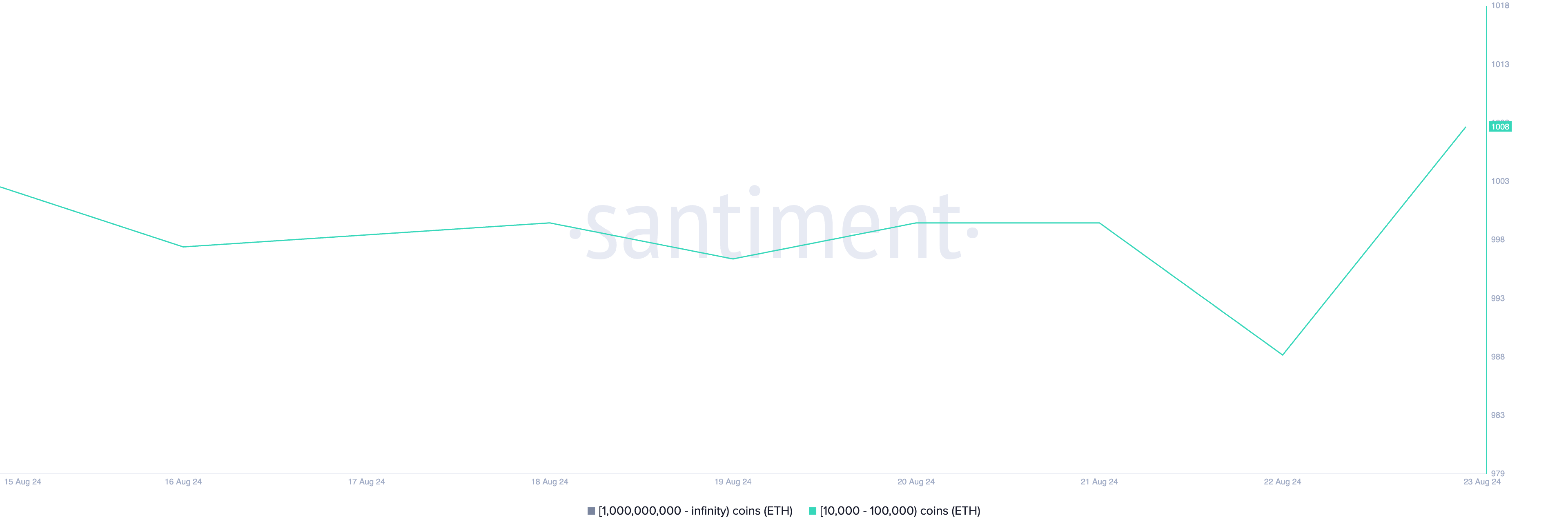 SponsoredUntungnya, aksi harga sideways ini tidak mengurungkan niat whale ETH untuk terus mengakumulasi koin. Menurut Santiment, jumlah alamat whale yang memegang antara 10.000 hingga 100.000 ETH telah mencapai 1.008, jumlah puncak dalam lebih dari sebulan.