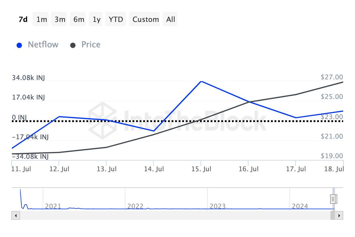 SponsoredMenurut IntoTheBlock, Arus Bersih Holder Besar meningkat pesat sebesar 141,50% dalam tujuh hari terakhir. Ini berarti crypto whale yang membeli INJ jauh lebih banyak ketimbang mereka yang menjual INJ.
