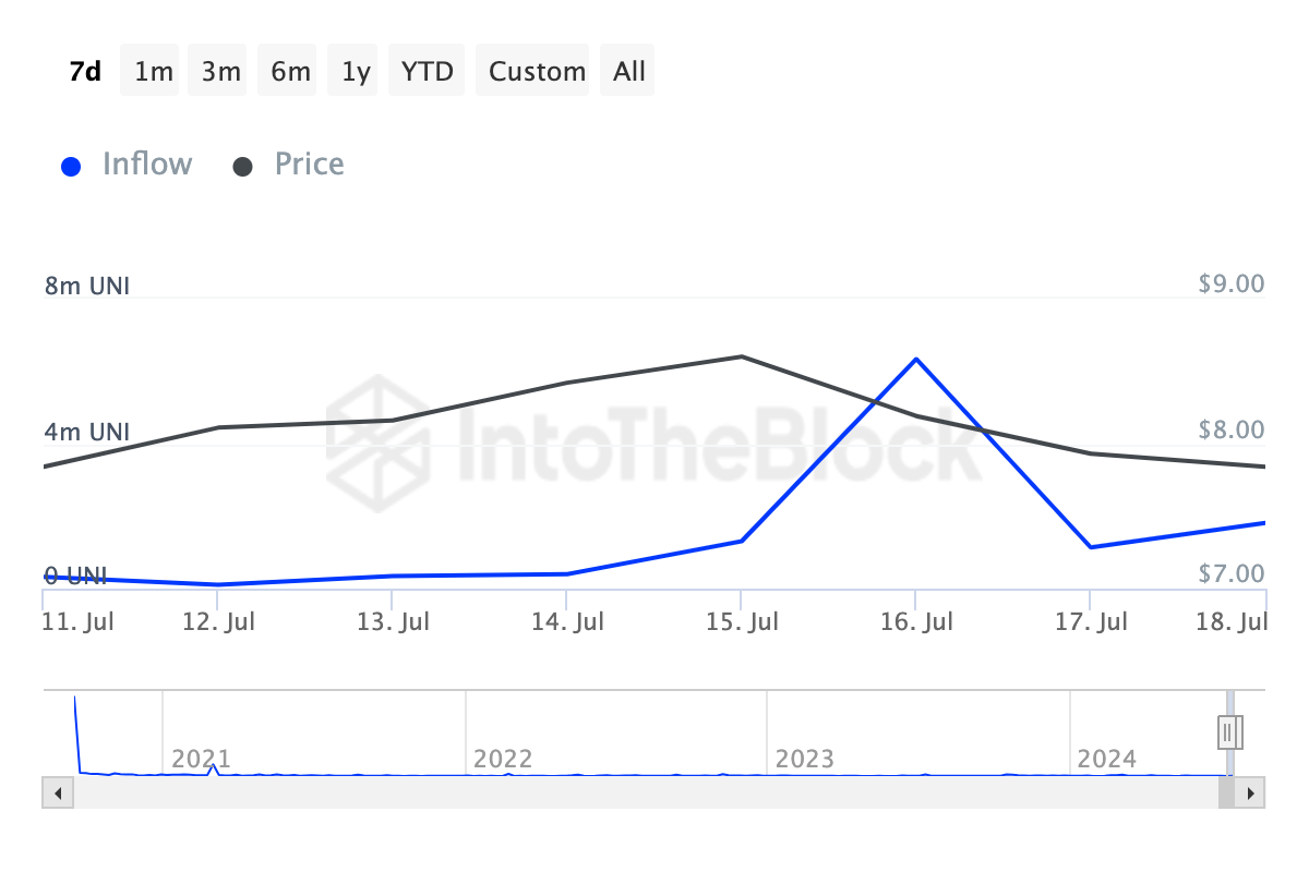 Menurut IntoTheBlock, metrik Arus Masuk Holder Besar Uniswap terpantau meningkat sebesar 1.570% dalam tujuh hari terakhir. Ketika metrik ini meningkat, itu berarti crypto whale sedang giat membeli aset; ketika turun, berarti mereka melepaskan sebagian kepemilikan mereka.