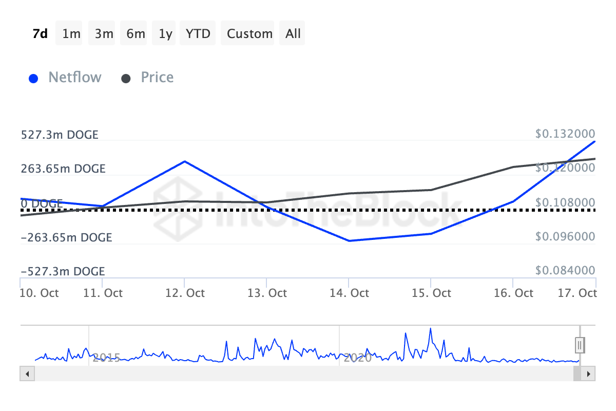 Sebagai meme coin terkemuka, Dogecoin (DOGE) kembali menarik perhatian whale kripto pekan ini. Mengacu data IntoTheBlock, arus bersih holder raksasa koin ini telah melesat 2.200% lebih. Per 17 Oktober, total arus bersih tersebut mencapai 527 juta DOGE (senilai sekitar US$71,46 juta), angka tertingginya sejak awal bulan ini.