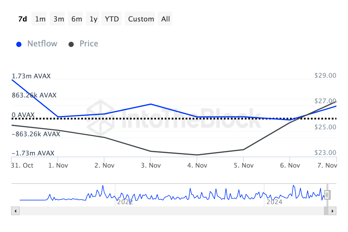 Altcoin terakhir yang menyita perhatian crypto whale pekan ini adalah Avalanche (AVAX). Pada 6 November, arus bersih holder besar AVAX tercatat -85.700, menunjukkan bahwa whale telah banyak menjual altcoin ini.