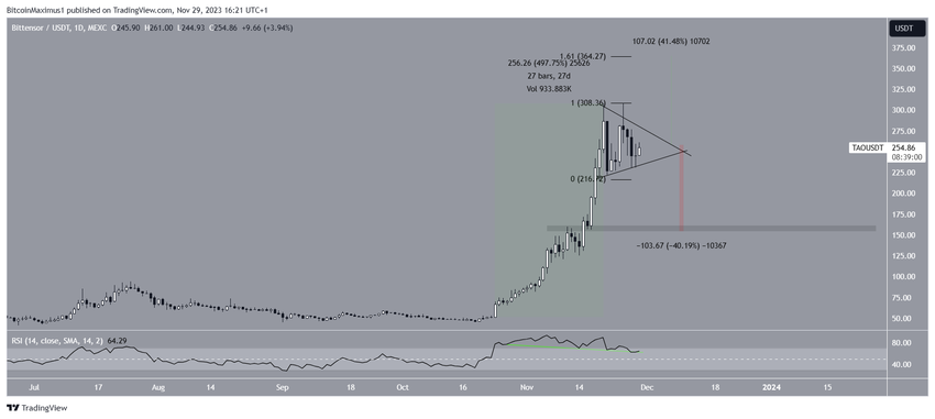 Meski prediksi harga TAO ini bernada bullish, penutupan di bawah pola segitiga tersebut dapat mengakibatkan penurunan sedalam 40% ke support terdekat di US$155.