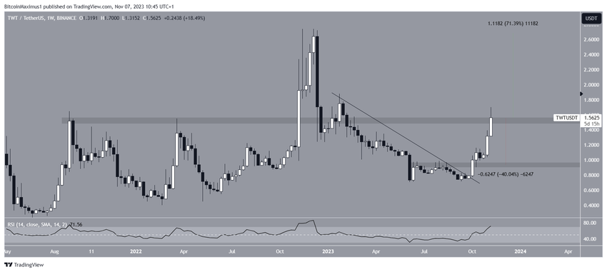 Harga TWT sudah breakout dari garis tren descending resistance jangka panjang pada bulan Oktober. Harga aset ini berhasil menyentuh puncak US$1,70 pada Senin (6/11), berlokasi tipis di bawah puncak tahunan US$1,87.