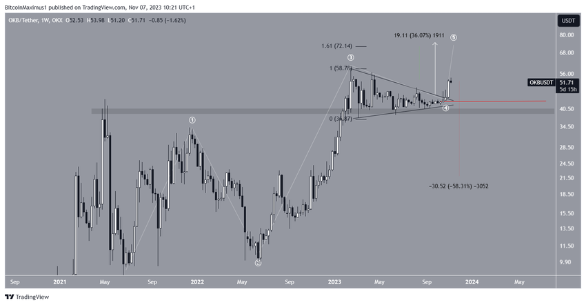 Namun, terlepas dari prediksi bullish harga OKB ini, aksi turun di bawah level terendah gelombang empat (garis merah) di US$43 dapat memicu kenaikan hampir 60% ke area support terdekat di US$20.
