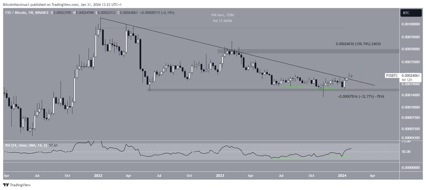 Harga FXS terjatuh di bawah garis tren resistance menurun sejak mencapai rekor tertinggi sepanjang masa (ATH) di ₿0,0012 pada awal tahun 2022. Garis tren ini telah divalidasi beberapa kali, yang mengakibatkan terjadinya penurunan hingga mencapai level terendah ₿0,00013 pada bulan November 2023.