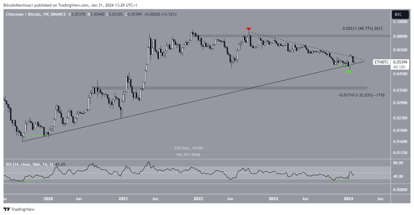 Kendati prediksi harga ETH ini bernada bullish, penutupan mingguan di bawah garis tren support naik dapat memicu penurunan sebesar 30% menuju area support terdekat di ₿0,036.