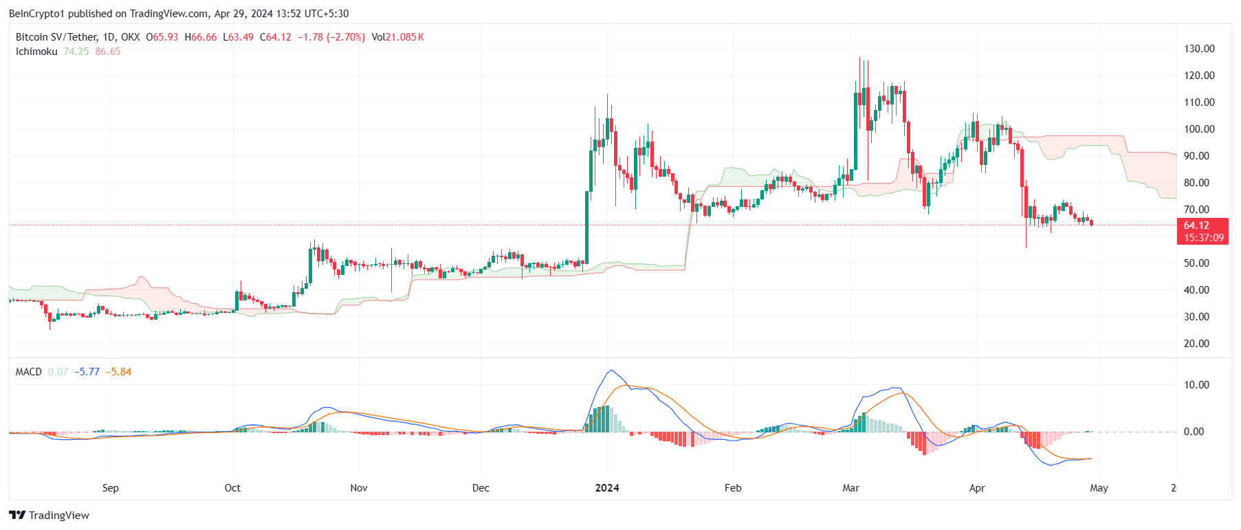 Bitcoin SV (BSV) merupakan hasil hard fork dari Bitcoin Cash (BCH). Harga BSV telah merosot di grafik sejak awal April. Akibatnya, altcoin ini sekarang diperdagangkan seharga US$64 pada saat publikasi artikel, sudah mencatatkan level terendahnya di tahun 2024.