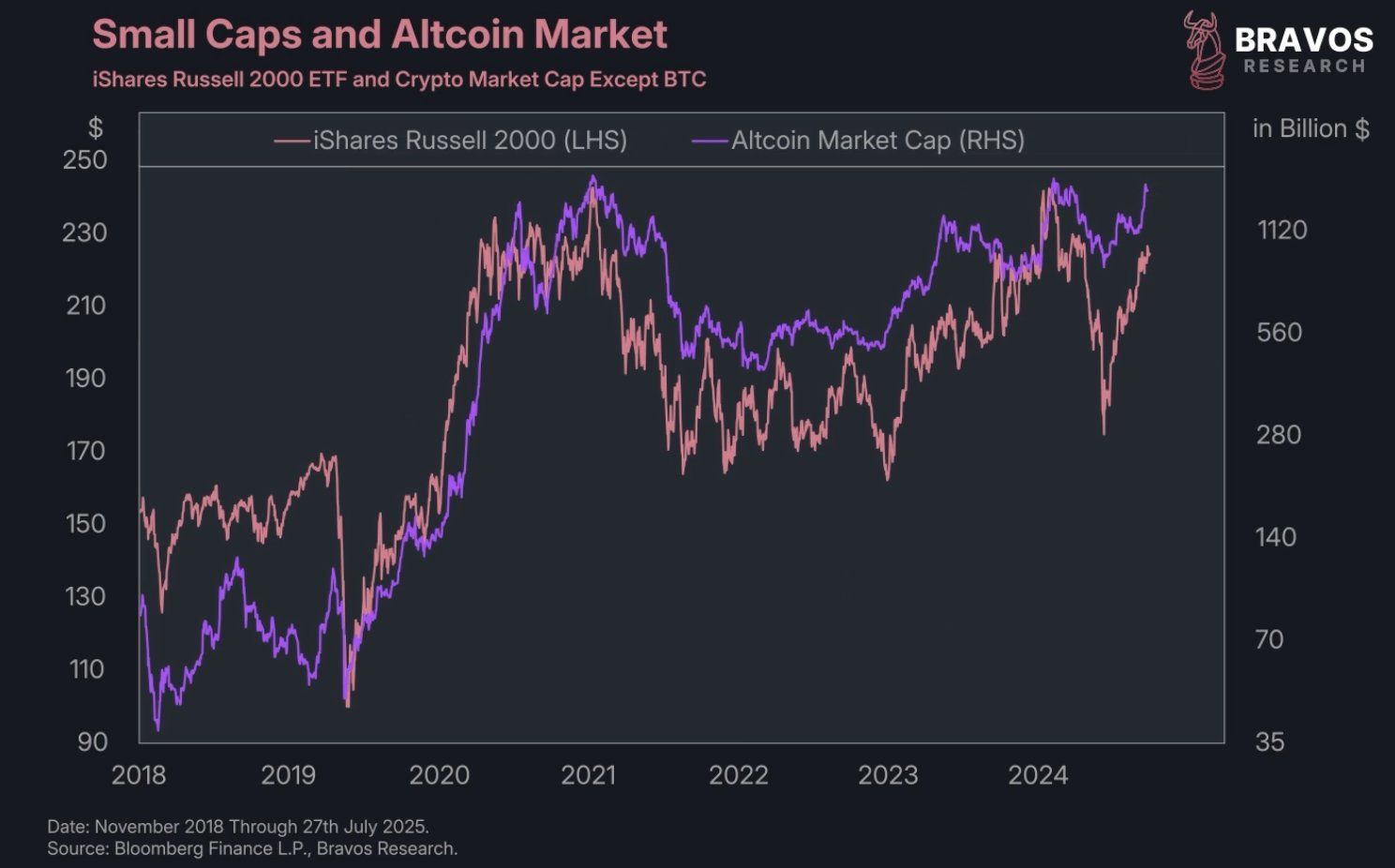 Menurut temuan Bravos Research, pasar altcoin menunjukkan korelasi kuat dengan saham berkapitalisasi kecil di AS, yang diwakili oleh Indeks Russell 2000.
