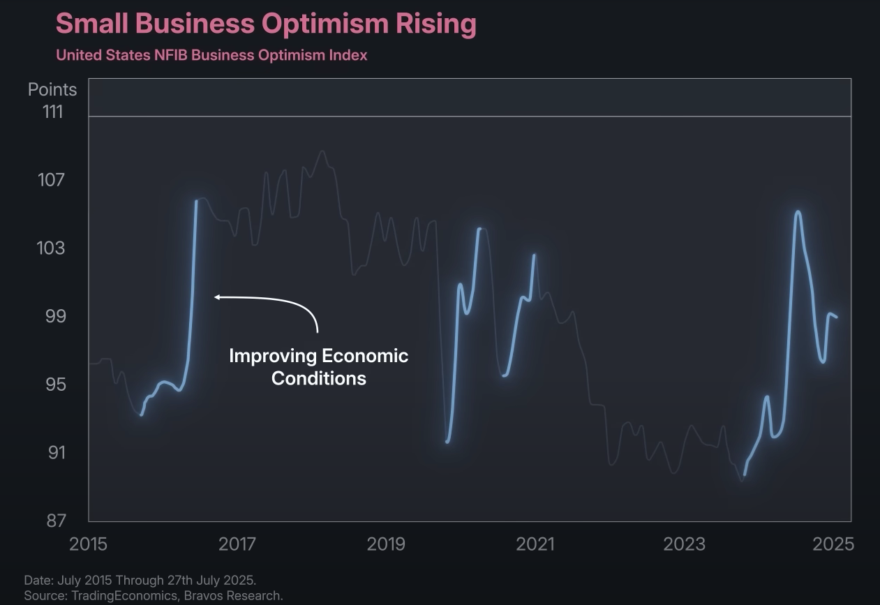 Namun, analisis tersebut juga menunjukkan peningkatan baru-baru ini dalam optimisme bisnis kecil. Indeks Sentimen Bisnis Kecil kini meningkat—mirip dengan tren tahun 2016, 2020, dan 2021—menandakan kondisi ekonomi yang membaik. Jika tren ini berlanjut, saham berkapitalisasi kecil mungkin akan melonjak.