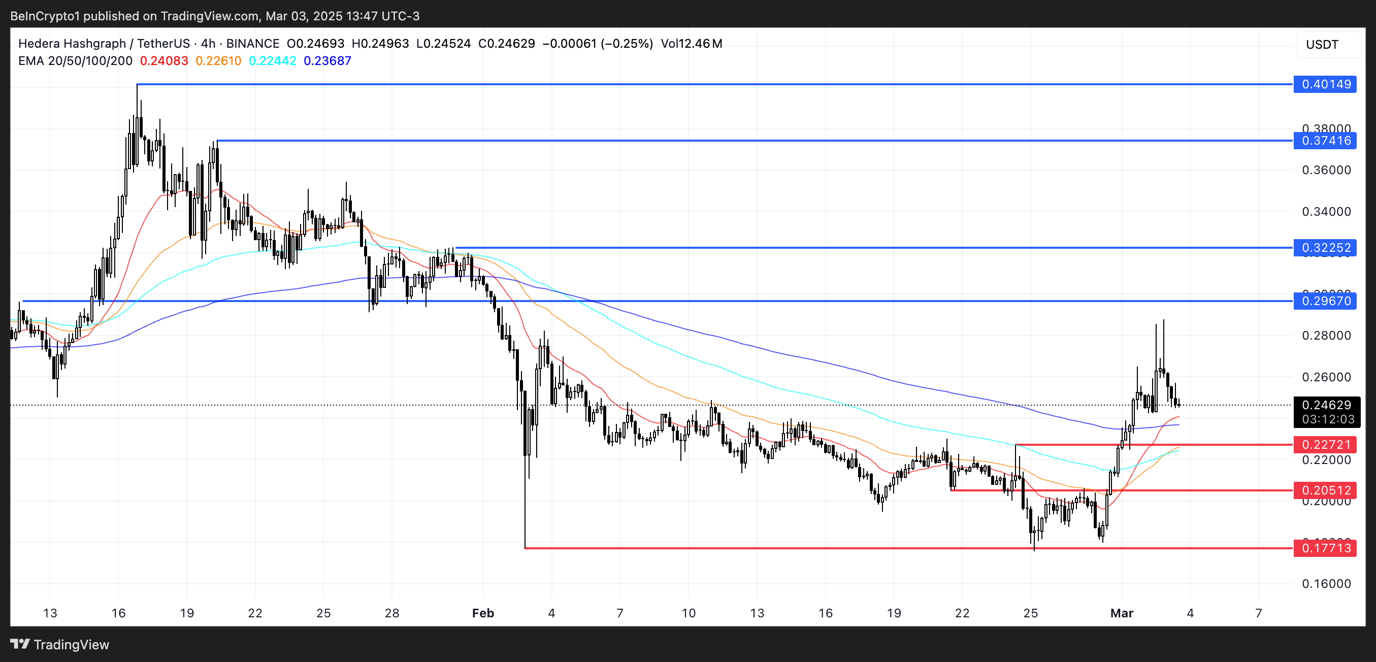 Andaikata HBAR masuk ke dalam cadangan kripto AS, harganya berpotensi meroket menguji resistance di US$0,29 dan US$0,32.