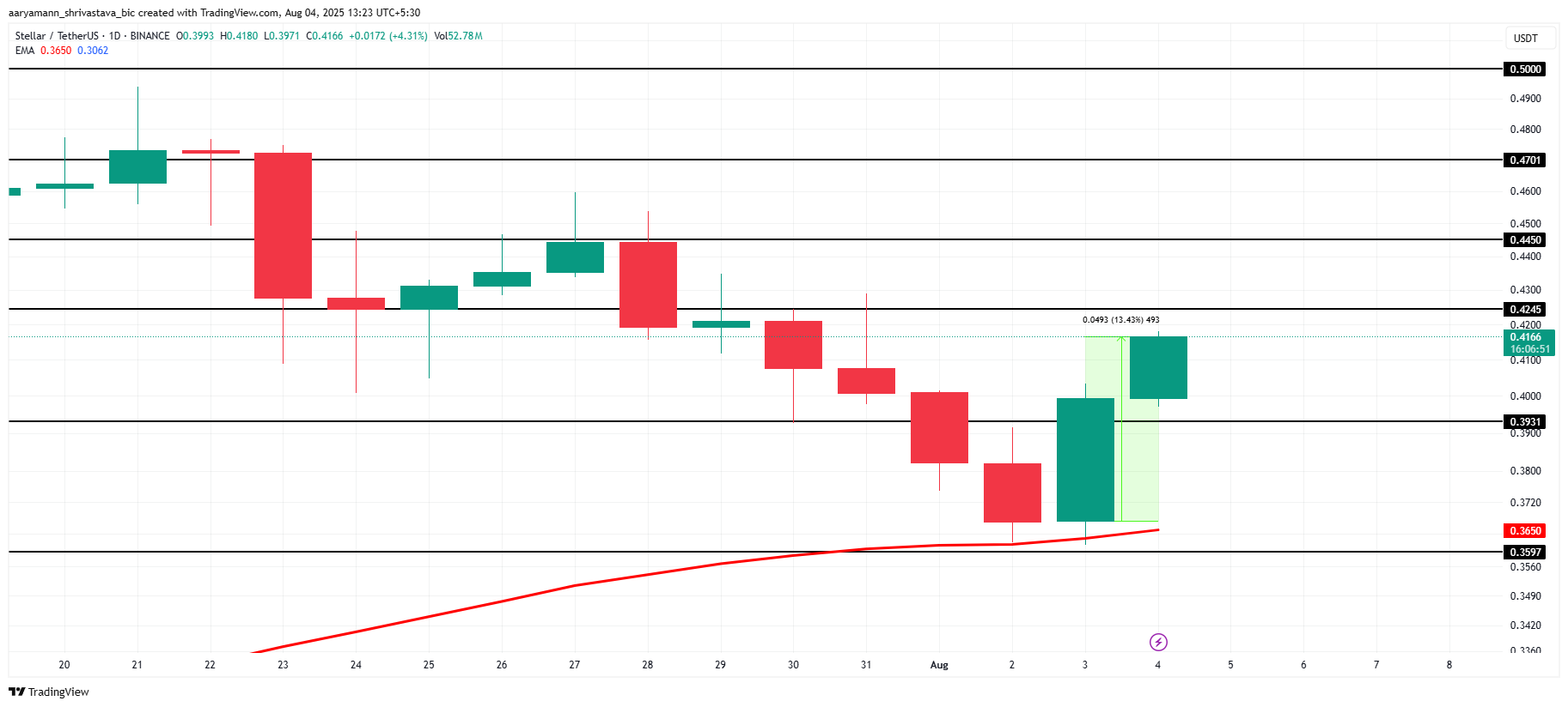 Harga XLM telah meningkat 13% dalam 24 jam terakhir, menempatkannya di antara altcoin top gainer. Diperdagangkan pada US$0,4166, altcoin ini tetap di bawah resistance US$0,4245. Ini menunjukkan potensi breakout jika kondisi pasar yang lebih luas tetap mendukung dan mendukung tren bullish.