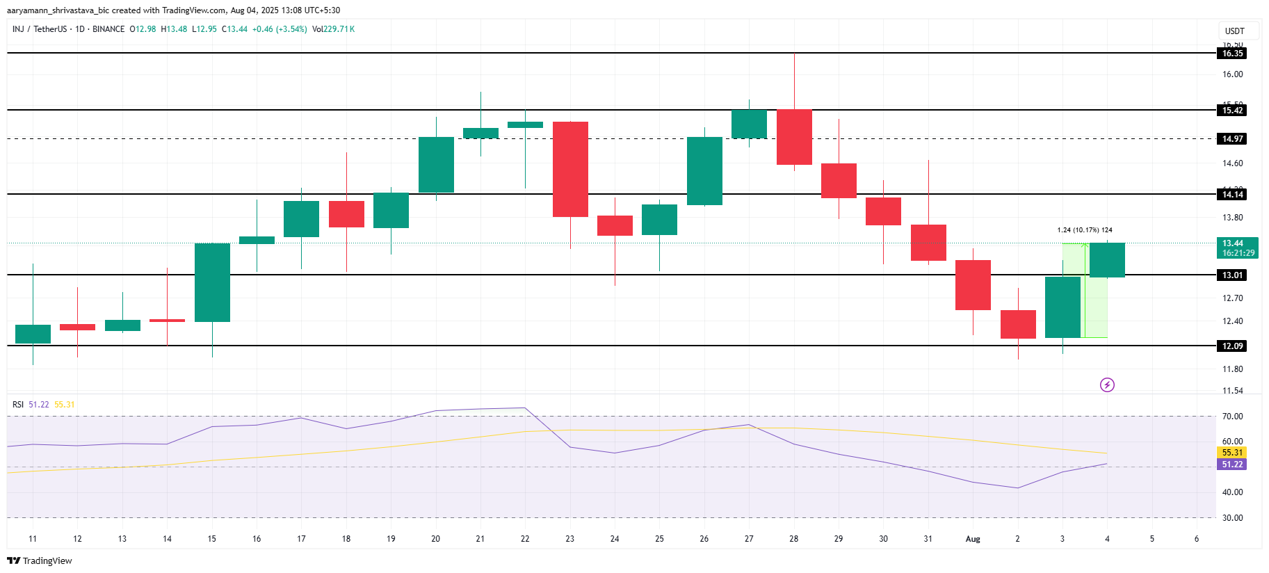Harga INJ telah melonjak 10% dalam 24 jam terakhir, memanfaatkan tren pasar yang bullish. Relative Strength Index (RSI) telah bergerak ke zona bullish di atas angka netral 50,0, menandakan peningkatan minat beli dan potensi pergerakan lebih lanjut dalam altcoin.