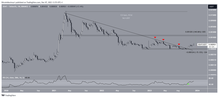 Namun, setelah berbagai upaya yang gagal, altcoin ini berhasil membentuk titik higher low pada Agustus 2023. Kemudian pada Oktober, setelah garis tren tercatat sudah bertahan selama 930 hari, DENT berhasil menembusnya.