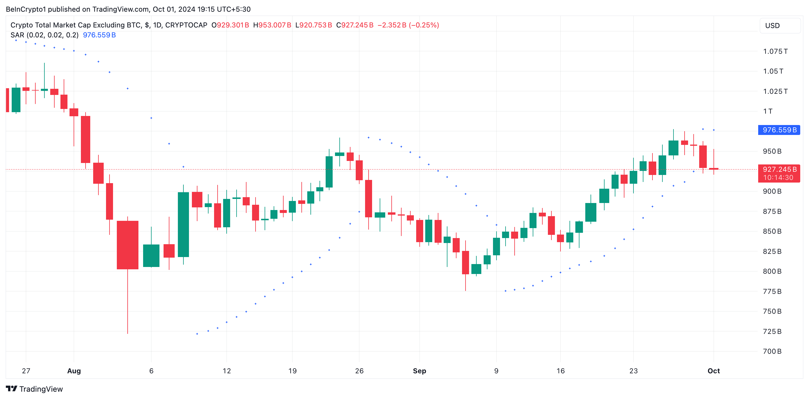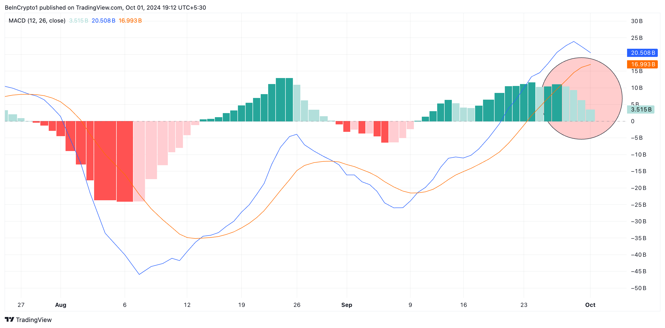 Namun, indikator momentum pada TOTAL2 mencerminkan bahwa tekanan beli mulai mengendur dalam beberapa hari terakhir. Ini terpicu oleh kian lesunya aktivitas pasar secara keseluruhan, sebab trader tengah menantikan hadirnya katalis untuk memulai “Uptober” yang begitu market antisipasi.