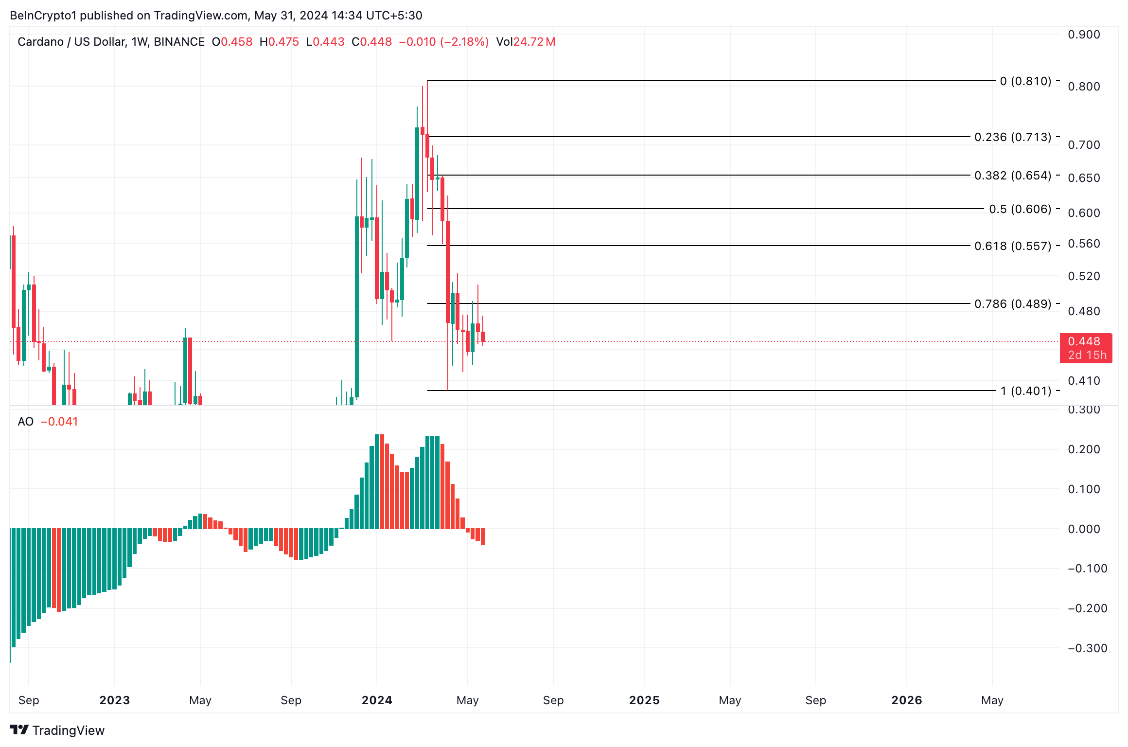Jika tekanan jual terus menanjak, harga ADA terancam ambruk ke US$0,40. Sebagai catatan, terakhir kali ADA diperdagangkan di level harga ini yaitu pada Desember 2023.