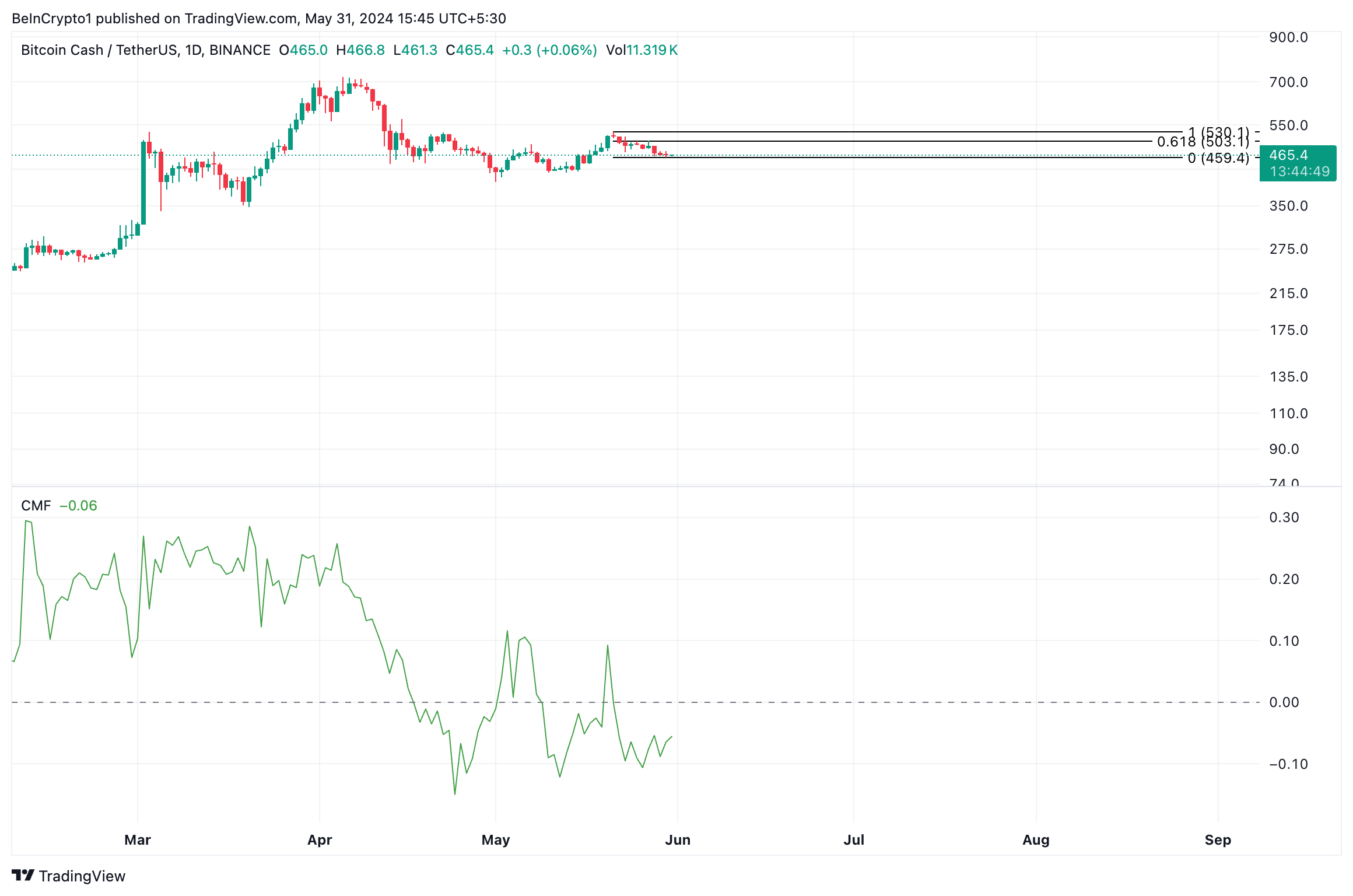 Adapun CMF untuk BCH sendiri telah bertengger di bawah garis nol sejak 23 Mei. Pada saat publikasi, nilai indikator ini berkitar di -0,06.