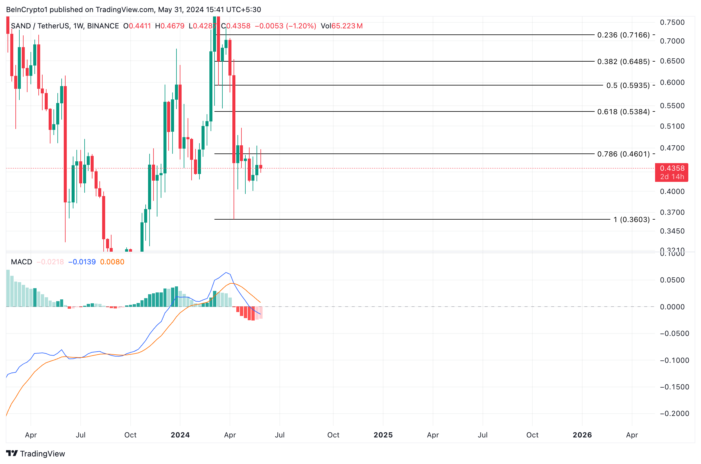 Jika aksi jual SAND mendapatkan momentum, SAND berisiko longsor ke bawah US$0,4 dan bermuara di US$0,36.
