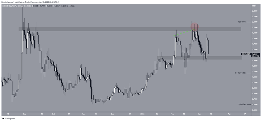 Saat ini, altcoin yang merupakan bagian dari ekosistem Shiba Inu itu sedang diperdagangkan di antara US$1,45 dan US$2. Kesanggupan BONE untuk breakdown atau breakout dapat menentukan tren harganya di masa mendatang. Adanya breakout dapat memicu kenaikan signifikan menuju US$2,60. Sementara itu, breakdown bisa jadi membuat harga BONE jatuh ke US$1,17.