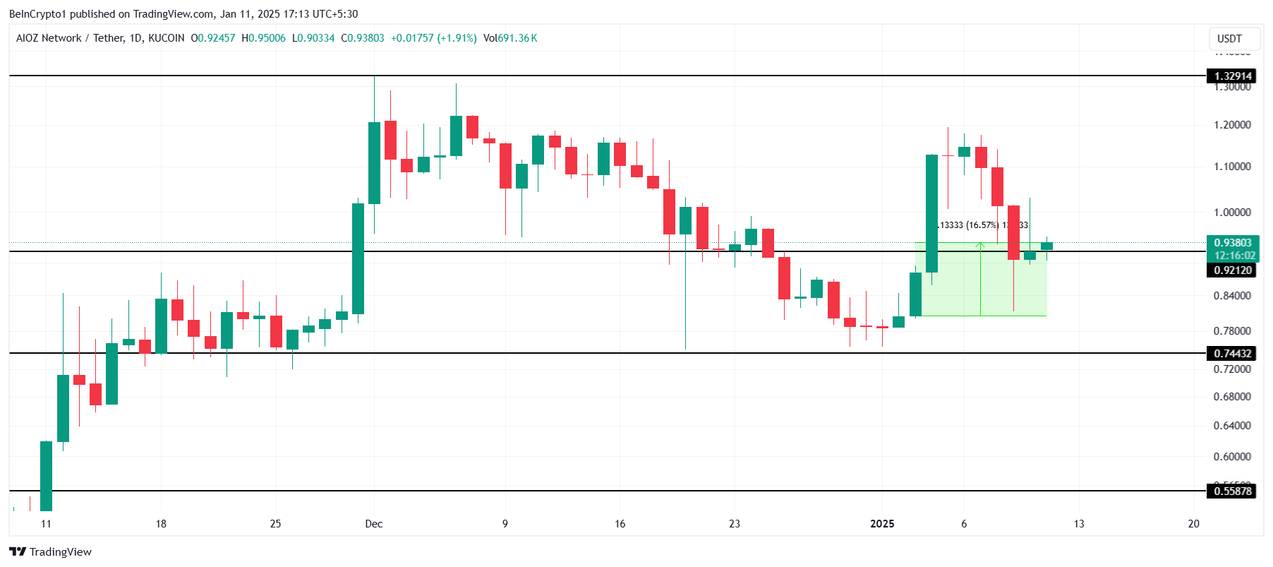 AIOZ menghadapi volatilitas harga yang signifikan pekan ini, dengan fluktuasi tajam yang menerpa beberapa hari terakhir. Kendati demikian, altcoin ini berhasil menorehkan kenaikan hampir 17%, mendorong harganya ke level US$0,93. Performa ini menunjukkan daya tarik aset ini di tengah kondisi pasar yang tidak pasti.