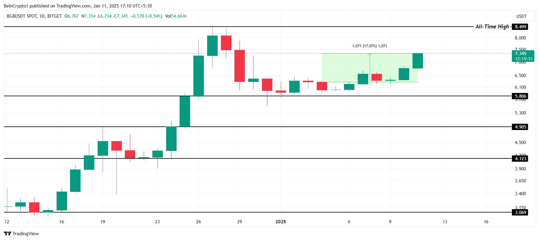 BGB mencatatkan rekor harga all-time high (ATH) baru di US$8,49 pada akhir Desember 2024. Namun, altcoin ini terkoreksi dan membentuk support penting di US$5,80. Penurunan ini mencerminkan volatilitas pasar secara keseluruhan tetapi juga menyoroti pentingnya mempertahankan level support ini guna menjaga momentum bullish di masa depan.