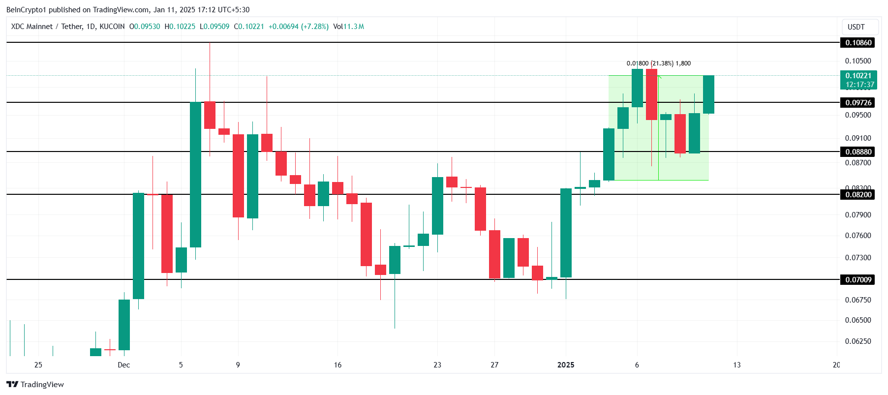 Harga XDC menguat 21% selama sepekan terakhir, mencapai US$0,102 dan berhasil menembus resistance kritis US$0,097. Kenaikan signifikan ini mencerminkan meningkatnya minat investor serta momentum pasar yang solid, menempatkan altcoin dalam posisi untuk melanjutkan pergerakan naik jika level support tetap kokoh.