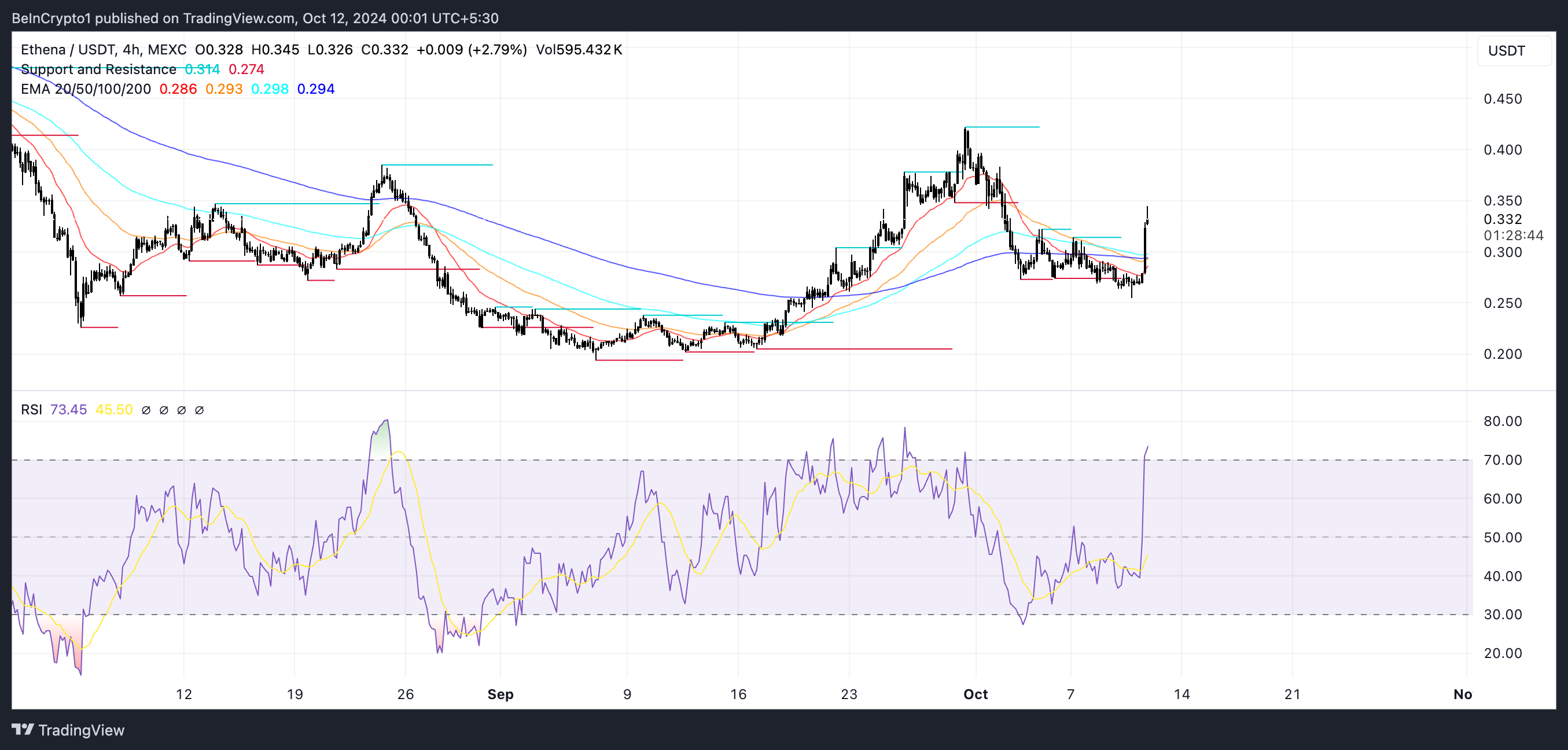 RSI untuk ENA telah meroket ke 73,19, naik dari 39 dalam waktu kurang dari sehari. Itu adalah sinyal adanya tekanan beli yang kuat tetapi juga bahwa aset sekarang sudah overbought. Jika reli berlanjut, ENA bisa mencapai US$0,42, yaitu peluang naik sebesar 27%.