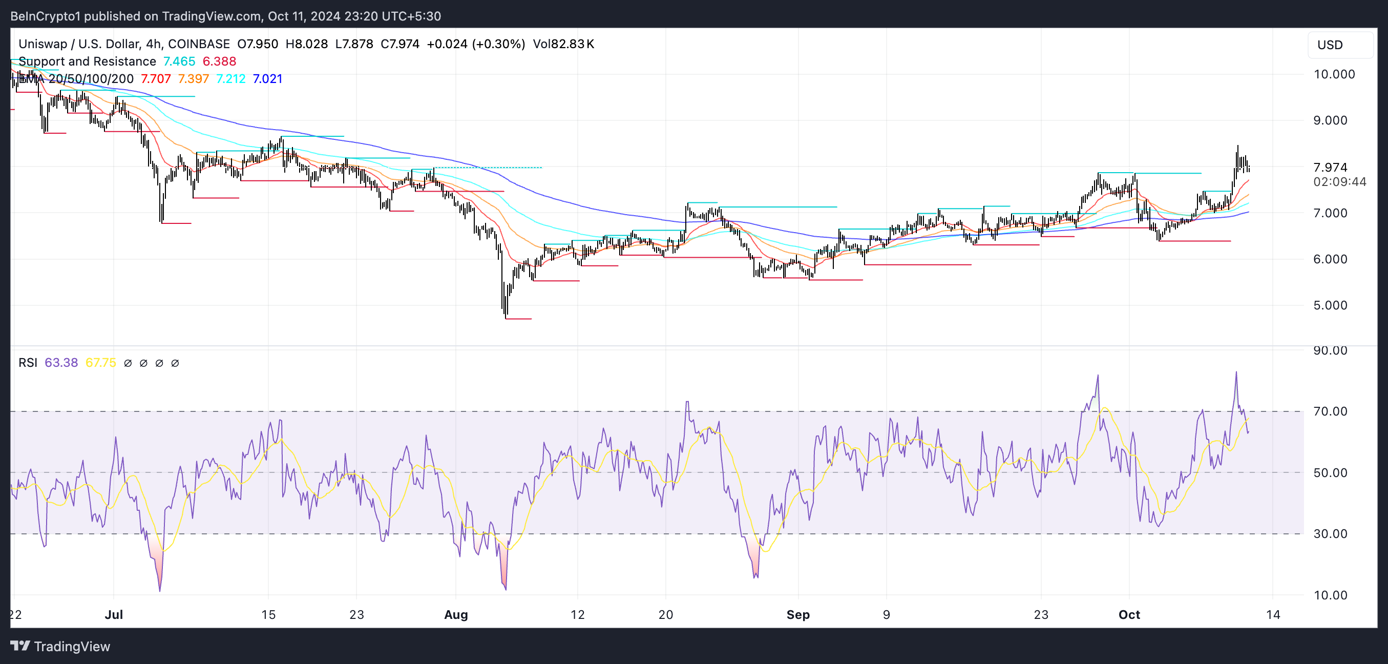 Garis EMA untuk UNI pun terpantau masih bullish, yang artinya tren keseluruhan masih positif. Jika UNI sanggup mempertahankan tren naiknya, altcoin ini bisa melakukan percobaan lain untuk menembus resistance di US$8,2. Jika berhasil, target berikutnya adalah US$8,6. Namun, RSI untuk UNI telah terjatuh ke 63, turun dari puncak 81 baru sehari yang lalu.