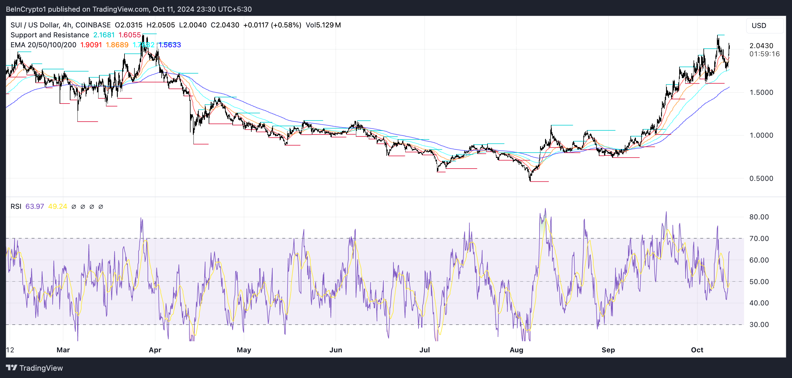 SUI telah muncul sebagai salah satu altcoin top gainer dalam tujuh hari terakhir, di mana harganya naik nyaris 16% selama periode ini. Reli yang substansial ini telah menarik perhatian para trader yang memanfaatkan momentum bullish koin ini. Garis EMA untuk SUI terpantau masih positif, maknanya tren keseluruhan masih naik.